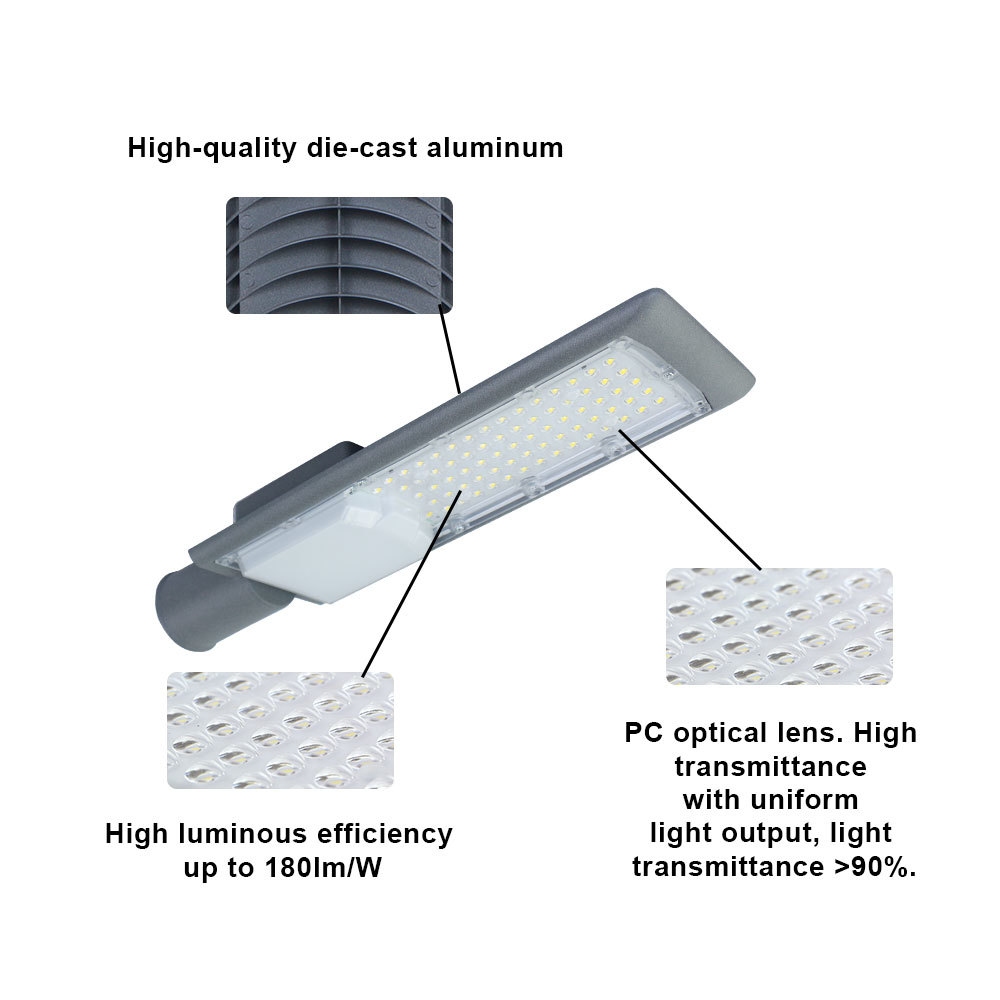 Deze veelzijdige straatverlichtingsoplossing is ideaal voor stedelijke en voorstedelijke omgevingen, waaronder woonstraten, commerciële wijken, snelwegen, parkeerplaatsen en industriële complexen.De duurzame constructie en weerbestendige vormgeving maken het geschikt voor alle buitenverlichtingstoepassingen die betrouwbare, langdurige verlichting